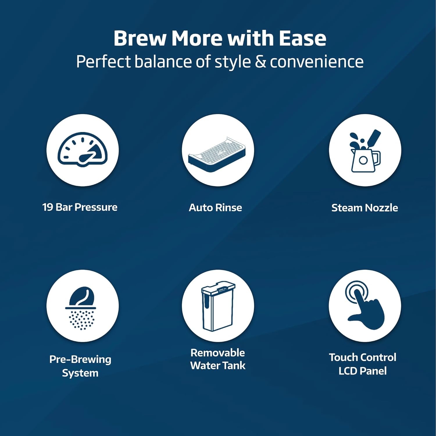ONE TOUCH LCD CONTROL- This sleek, professional machine features a LCD touch control panel, where you can easily choose between functions. Simply select single or double espresso to create your perfect beverage.