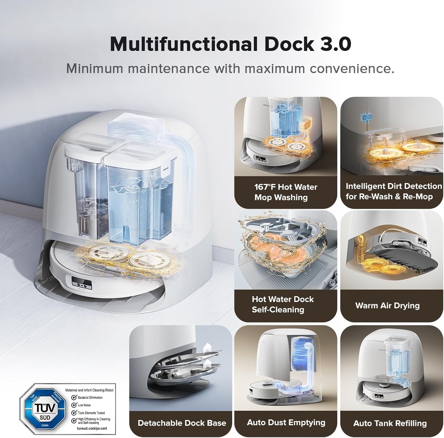Hands-Free Multifunctional Dock 3.0: Enjoy spotless floors without lifting a finger. The multifunctional dock provides 167°F hot water mop washing, ensuring a deep, hygienic clean. Dock self-cleaning with hot water and the warm air drying feature ensure your mop and floors stay fresh and well-maintained, giving you peace of mind every time. The intelligent dirt detection system ensures mops are thoroughly cleaned and re-mopped as needed. Enjoy auto dust emptying for up to 7 weeks, auto tank refilling, and a detachable base for added convenience.