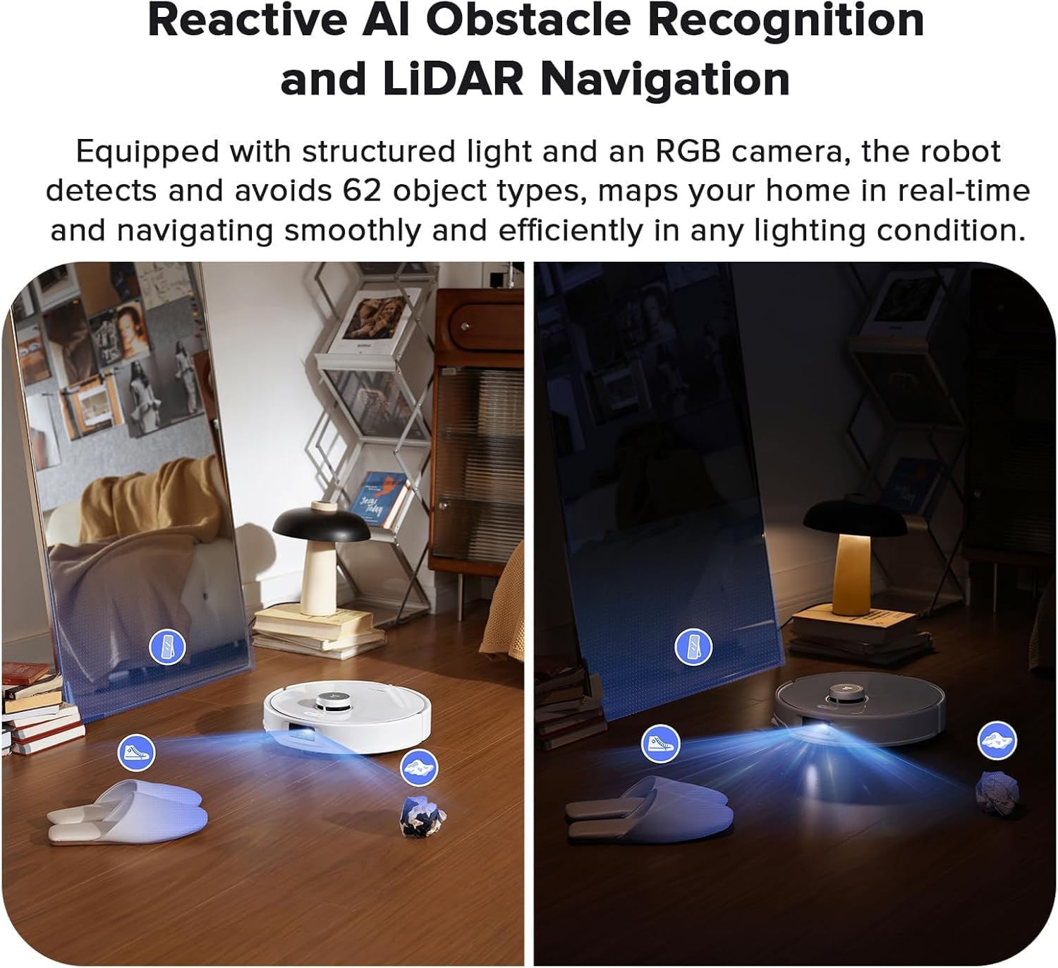 Advanced Navigation: Experience collision-free cleaning with Reactive AI, RGB cameras, and structured light, recognizing and avoiding 62 object types. PreciSense LiDAR creates real-time maps for optimal cleaning routes.